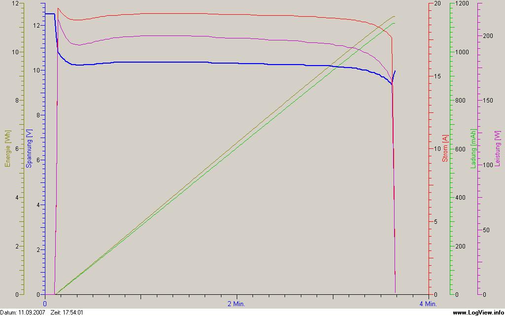 Immerhin konnten bei 19A und ordentlicher Spannungslage 1,11 Ah entnommen werden.