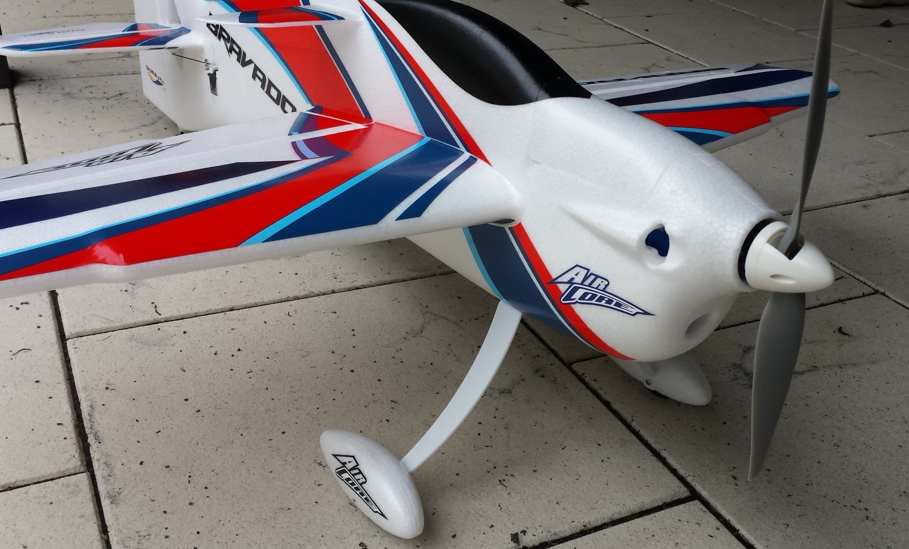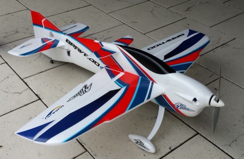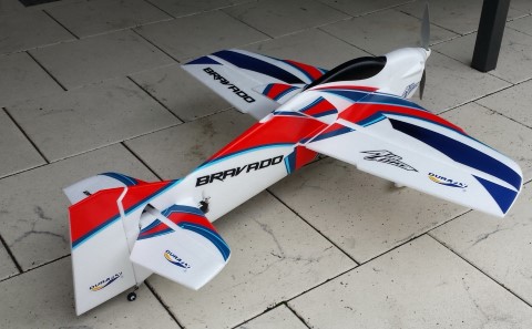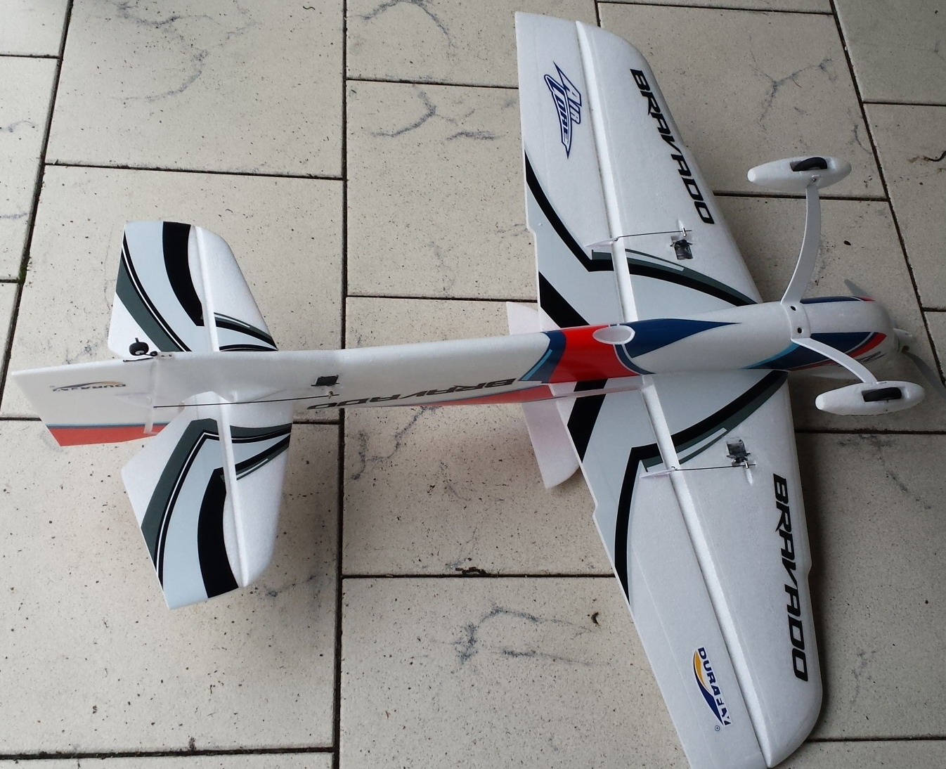Der Bravado von Durafly wurde von Hobbyking Europa preisgünstig angeboten und zügig geliefert. Die Schaumteile sind von vorzüglicher Qualität und 100% passgenau. Ruder und Fläche passen stramm in den Rumpf, die gewünschte Geometrie dieser Teile ergibt sich von selbst, die Abstände und das Fluchten von Fläche und Leitwerken mussten nur noch kontrolliert werden. Die Dekofolie ist sauber geschnitten und aufgebracht, es sind nur minimale Nacharbeiten nötig. Die Motorhaube wird, wie üblich mit Magneten befestigt. Sie ist fertig und passgenau. Der darüber zugängliche Bereich genügt, um Akku und Empfänger komfortabel unterzubringen. Für den Akku ist ein Kunststoffbrett eingebaut. Ein Problem sind die eingebauten Digital-Servos TG9d. Diese hatt ich mir leider früher schon mal gekauft und wusste, dass die Quote mit inakzeptabler Rückstellgenauigkeit bei ca. 50% liegt. So war es auch hier. Die Servos wurden also alle herausoperiert und durch ebenfalls preisgünstige, aber genaue und kräftige Exemplare von D-Power ersetzt.Dabei gefallen mir die billigeren Analogservos AS-225BB MG besser als ihre digitalen Brüder DS-220 MG.