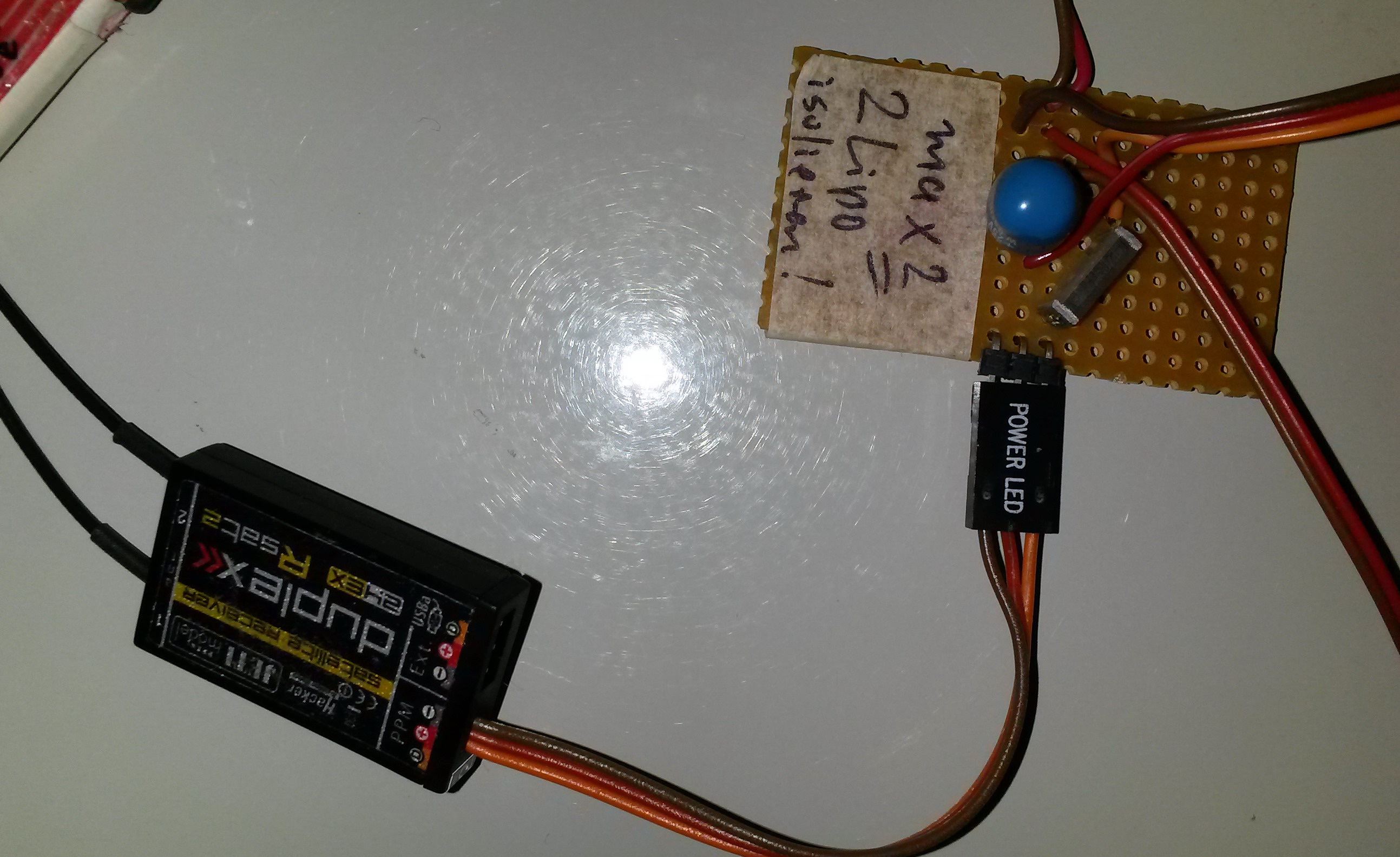 Freundlicher Weise arbeiten der RSat Empfänger und das Sendemodul teilweise im gleichen Spannungsbereich, so dass ein 2s Lipo mit 7 - 8,4 V für beide passt. Inzwischen gibt es übrigens den Jeti-Empfänger "easy Kopter", der auf die Ausgabe des Summensignals spezialisiert und preisgünstiger als der RSat-Empfänger ist.