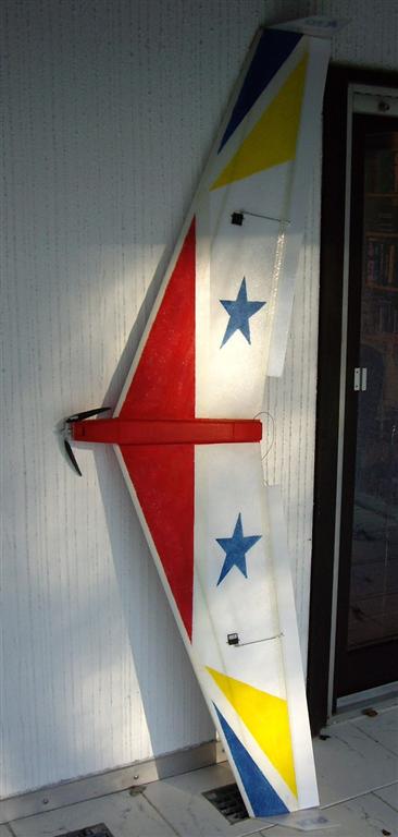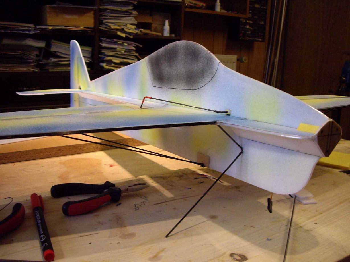 Das Modell ist schnell gebaut. Man sollte sich an den Flächenumriß und den Schwerpunkt halten. Der Rest ist Kür. Für die Fläche habe ich ein 6mm starkes grünliches Dämmmaterial aus dem Baumarkt verwendet. Es hat an der Unterseite Rillen, in die sich die 2mm Kohleholme gut einkleben lassen. Der Rumpf besteht aus 2cm Styropor mit einem 2mm Balsagurt an der Unterseite. Ich habe ihn etwas umgestaltet, damit der Motor besser eingebaut werden kann und das Modell von der Seite etwas mehr wie ein Flugzeug aussieht. Das Seitenruder ist aus 3mm Selitron. Das Fahrwerk wurde wie bei der Styro/Depron Su aus Kohleband hergestellt. Stahldraht geht natürlich auch. Ich hatte zunächst auf die Anlenkung des Seitenruders verzichtet, dies aber zwecks besserer Wendigkeit, Hooverns und Lenkung beim Rollen nachgeholt. Will man ohne Seitenruderanlenkung hoovern, sollte man die Querruder schräger als im Bauplan vorgesehen anbringen.