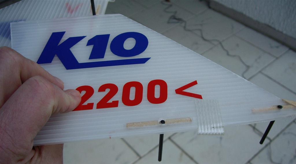 Das Bild oben zeigt das Modell zwecks Größenvergleich mit einem Pico-Jet. Der Erstflug wurde ohne Lackierung durchgeführt, um zu sehen, ob die Flugeigenschaften diese Arbeit wert sind. Weil gerade nichts anderes frei war, kam ein 45gr. schwerer Axi 2208 mit dem 2AH 3s Tanicpack in den Flieger. Mit den damit kurzzeitig umsetzbaren 100W Eingangsleistung kann man das Modell durchaus schon auf Höhe bringen. Das Modell kann also in low-cost Ausführung auch mit Speed 400-480, vorzugsweise mit Getriebe, ausgerüstet werden. Die Flugerprobung ergab ansprechende Flugeigenschaften und ein beeindruckendes Flugbild. Durch die geringe Flächenbelastung wird auch schwacher Aufwind und Thermik gut angenommen. Der Gleitflug ist sehr gut und stabil, Kurven lassen sich eng und flach fliegen. Allerdings ist das Modell in dieser Auslegung nur für Segelflug bei leichten Wind geeignet. Bei einer Windstärke von ca. 3 kommt man mit der schwachen Motorisierung kaum noch vorwärts, der Gleitflug gegen den Wind geht fahrstuhlartig abwärts, weil die Windgeschwindigkeit gerade der Gleitfluggeschwindigkeit entspricht. Ist auch logisch bei der Stirnfläche des großen Flügels, dem geringen Gewicht und dem Luftwiderstand der rauhen EPP-Oberfläche. Mit einem größeren Motor werden sich die Segeleigenschaften bei Wind nicht wesentlich ändern, allerdings wird man dann die Monster K10 als Motorflieger benutzen können. Empfehlenswert !