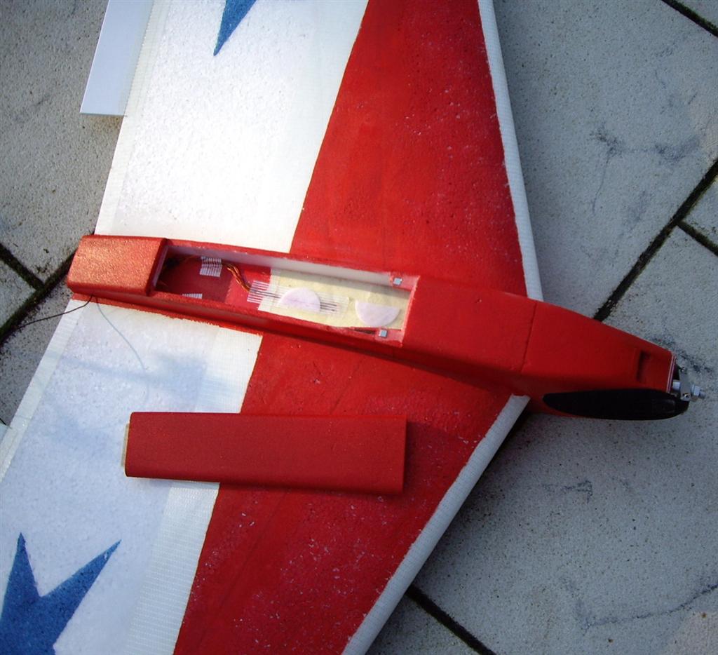 Inzwischen wurde das Modell auf den Graupner 350/8,4 umgerüstet, was sich aufwendiger erwies, als zunächst geplant. Für den größeren Motordurchmesser mußte ein neuer Motorspant nebst geänderter Rumpfnase hergestellt werden. Wegen der schwereren Motor-Reglerkombination mußte der Akku zurück, was einen längeren und höheren Rumpf auf der Oberseite erforderte. Mit Depron war das allerdings kein Problem. Die Rumpfabdeckung über dem Akku-Fach wurde in gewohnter Weise mit Magneten befestigt. - Bild - Mit dem Tanic Lipo oder einem jetzt eingesetzen 3s1200 Lipo von MZ hat das Modell genug Kapazität an Bord, um auch mit dem leistungsfähigeren Antrieb sehr lange geflogen zu werden. Da die Motor-/Luftschraubenkombination unnötig stark für das Modell ist und einen größeren Akku nötig machen würde, habe ich die Funktion des Genius-Reglers zur Begrenzung der Drehzahl auf 7000 U/min verwendet. Damit steigt das Modell mit ca. 45° und die Stromaufnahme liegt unter 20A.