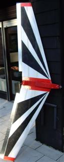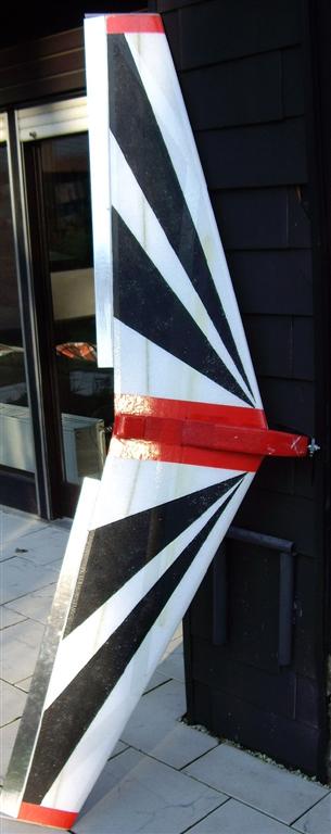 Zunächst ist zu entscheiden, ob der 2,2m - Flügel am Stück oder teilbar gebaut wird. Nachdem ich die beiden Flächenhälften probeweise mit Klebeband verbunden hatte und das Teil nach einigen Versuchen einen Platz im Kombi fand, sparte ich mir die Arbeit und das Mehrgewicht für eine teilbare Fläche. Die Fläche wurde in Abweichung von der Herstellerempfehlung mit gerade verfügbaren CFK Rohren und -Stäben verstärkt. Wenn man Flachstäbe und Rohre von max 5mm nimmt, kann man das EPP einfach einschneiden und die Stäbe/Rohre mit Epoxy hineindrücken. Wenn man ein dünnes Alu-Röhrchen in eine Injektionsspritze klebt, kann man das Epoxy sehr sparsam dosiert in die Einschnitte spritzen. Es verblüfft immer wieder, wie ein paar dünne CFK-Profile das elastische EPP stabilisieren. Da ich ggü. der Bauanleitung weniger CFK einbaute, habe ich in gewohnter Manier mit ein paar Streifen Glasfaser-Klebeband getaped. Da fest verklebte Winglets beim Transport hinderlich und gefährdet wären, wurden sie mit 3mm CFK-Rundstäben und passenden Alu-Röhrchen abnehmbar gemacht.Bild