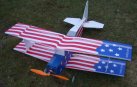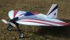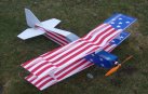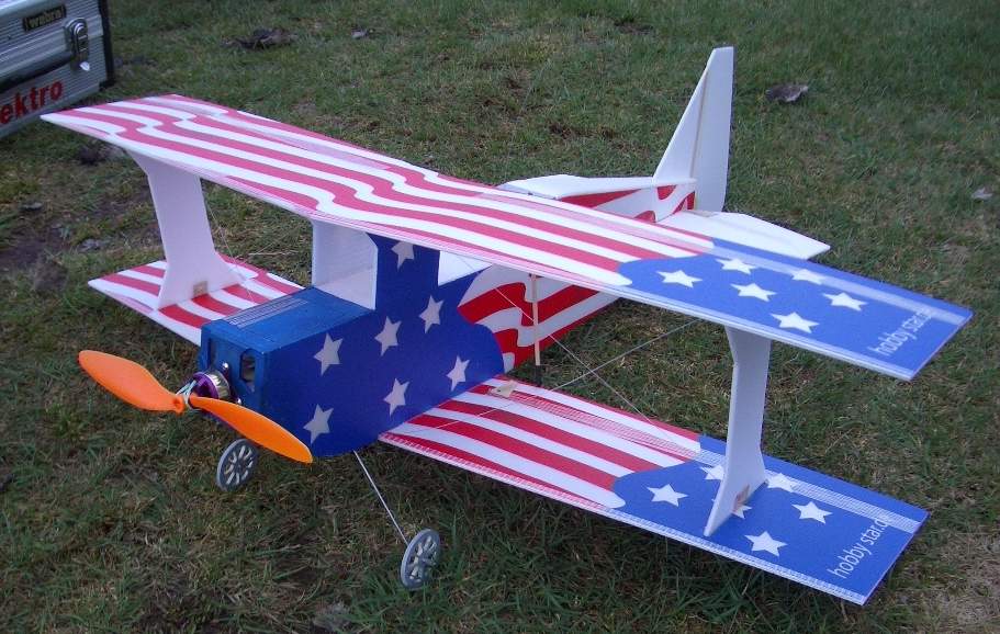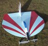 Die Ulti ist mir so quasi zugelaufen. Ein Bekannter sagte " schau mal, was ich auf der Messe gesehen habe" und drückte mir den Bausatz in die Hand. Qualität und Verarbeitung der Depron-Teile waren ( bis auf die stark verbogenen Flächenstreben ) in Ordnung, konstruktive Details verbesserungsbedürftig: Der Kastenrumpf ist ohne Hilfskonstruktion kaum verwindungsfrei zu verkleben - die Verspannung mit dünnen Nylonfäden ist zwar leicht, die Flächen verwinden sich aber nach längerer Standzeit und erst recht im Flug - die Verbindung vom Rumpf zur oberen Fläche reißt bei geringfügiger Beanspruchung. Abhilfe: für den Zusammenbau des Rumpfes später zu entfernende Hilfsspanten, die Nylonfäden wurden durch Kohlestangen ersetzt, der Übergang zur oberen Fläche mit Strapping-Tape verstärkt. Der Motorspant wurde durch eine leichtere Konstruktion aus GFK-beschichtetem Balsa ersetzt. Für den Empfänger bekam der Rumpf unten eine Klappe, der Akku wird durch eine weitere Klappe von oben hinter dem Motor eingesetzt. Eigentlich ist das Modell schön bedruckt, für die Leitwerke und die Unterseite hat die Farbe aber offensichtlich nicht mehr gereicht. Das Modell wurde mit 154 gr ohne Akku sehr leicht, mit dem 24gr leichten Micro Cyclon und einem leichten Regler ist der Schwerpunkt aber auch mit 2x830er Lipo nicht ohne Trimmgewicht einzustellen. Bei der kurzen Rumpfschnauze und dem voluminösen Kastenrumpf hinten auch kein Wunder.