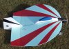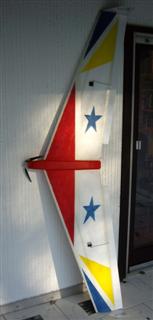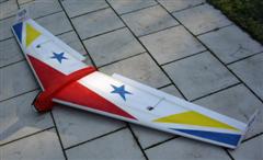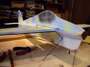 Die Bauweise habe ich analog zu den Ikarus Modellen geändert. Das heißt, ich habe je eine komplette Rumpfober- und unterseite getrennt hergestellt. So kann man zunächst auf dem Baubrett die waagerechten Rumpfteile mit den Flächenhälften und dem HLW verkleben. Dadurch bleibt alles erst mal schön glatt und eben. Anschließend wird die untere Rumpfhälfte aufgeklebt. Während alles immer noch auf dem Baubrett und damit plan bleibt, werden Torsionsverstärkungen vorn und hinten angeklebt, die Servos für Seite und Höhe befestigt, die Querruder angelenkt usw. Das Modell kommt somit erst dann vom Baubrett, wenn alles stabilisiert ist und nur noch Rumpfoberteil, Querservo und Motorspant anzubringen sind. Vor dem Zusammenbau wurden die Teile mit verdünnter Acrylfarbe und einer billigen Airbrush - sehr dünn - etwas farbig gestaltet. Künstlerische Ambitionen hatte ich dabei nicht. Der Aufbau des Modells ist konstruktiv sehr durchdacht und vereint minimalen Material- und Gewichtseinsatz mit maximaler Stabilität. Beim Bau habe ich auf das Gewicht geachtet, dann aber Standard - Komponenten verwendet. Bei Empfänger- und Servogehäusen, Verdrahtung usw. sind also noch Gewichtsreduzierungen möglich. Bewegt wird das Teil z.Zt. von dem Micro Cyclon an 2 Kokam 360.