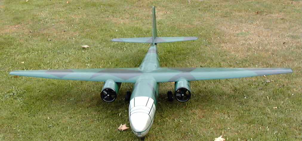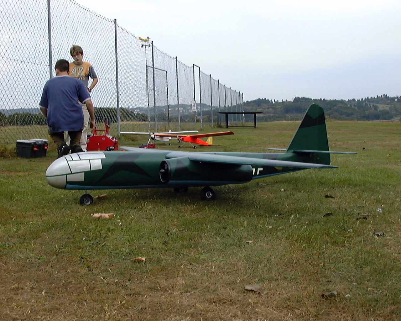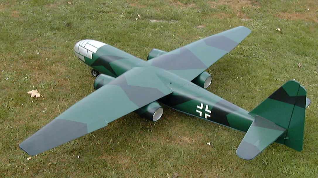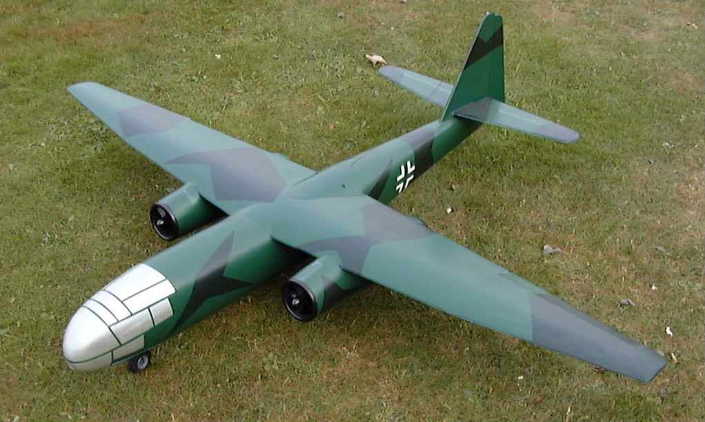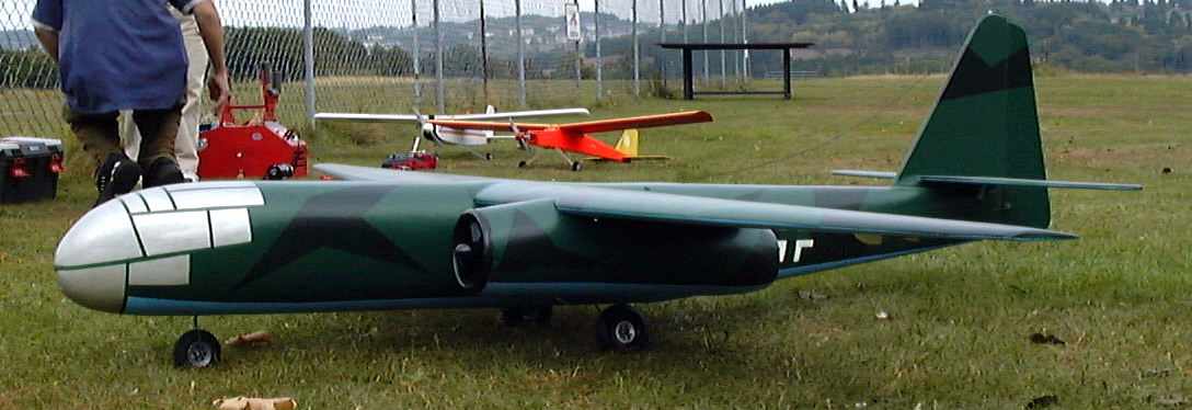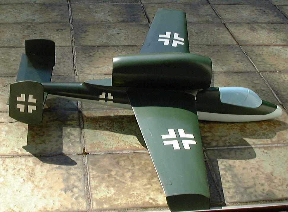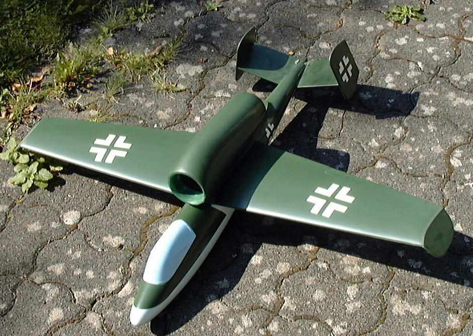 Die Heinkel-Salamander der Fa.FVK in Kaiserslautern ist ein in sehr guter Qualität vorgefertigtes und dennoch preisgünstiges Voll-GFK-Modell. Nach der Bauanleitung sid die kleinen Schwerdtfeger- oder Wemo-Impeller ganz vorne oder ganz hinten einzubauen. Weil das nicht gut aussieht und zwecks besserer Strömung habe ich einen durchgehenden Luftkanal aus 2 Lagen 80gr Glasgewebe über eine 0,5ltr. Coladose gewickelt eingebaut. Der Auslasskonus wurde über einen billigen Platikbecher gewickelt.(siehe Tipps) Beides paßt exakt ineinander und in das Impellergehäuse des Modells. Das Motorgehäuse und die Statoren bestehen aus Sperrholz, der Originalläufer von Schwerdtfeger paßt mit 1mm Spalt in das über die Coladose gewickelte Schubrohr. Mit 9Z Sanyo 1400KR und Speed 480 Race ist das Modell gut motorisiert. Abstriche sind allerdings bei den Flugeigenschaften zu machen, wahrscheinlich durch die ungünstige Anordnung des Impellers ( hochliegender Schwerpunkt und Kippmoment bei Lastwechseln) Das zwischenzeitlich auch auf 3s/2200 Lipo umgerüstete Modell hat einen neuen Besitzer.