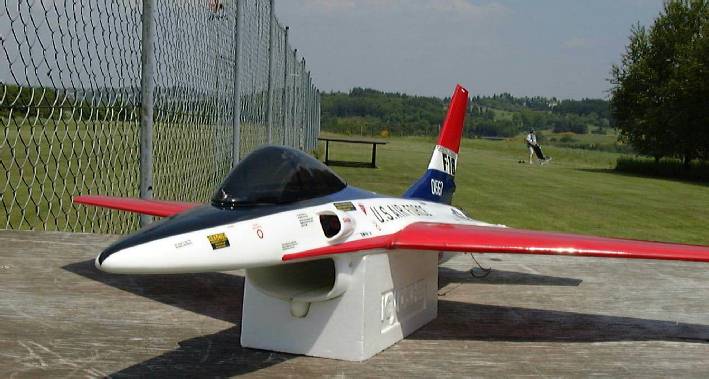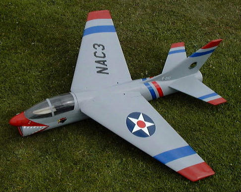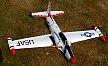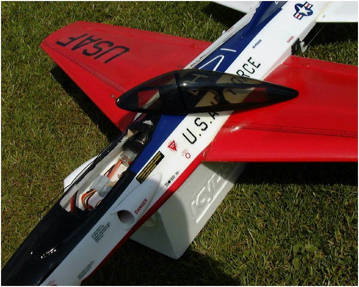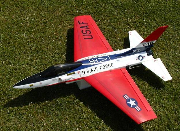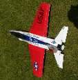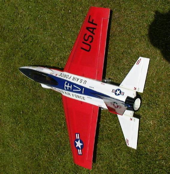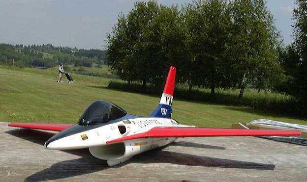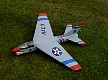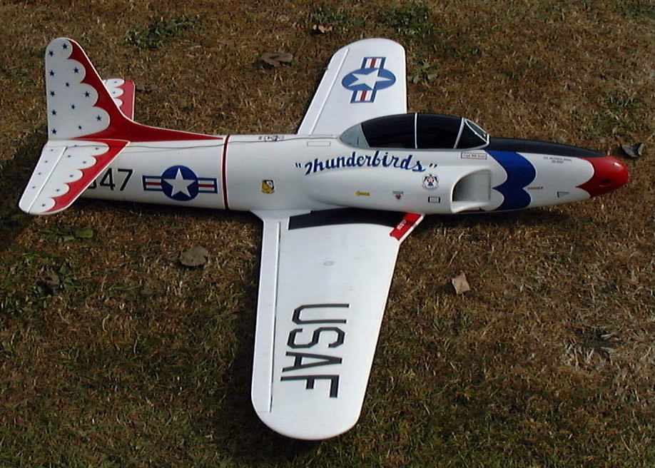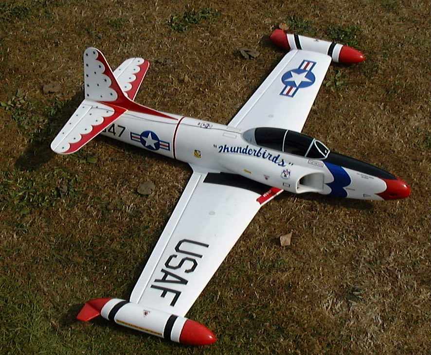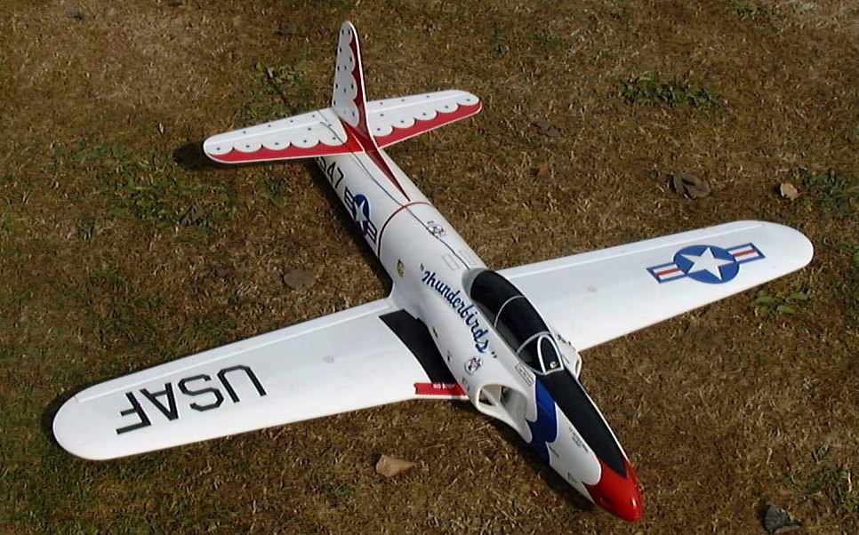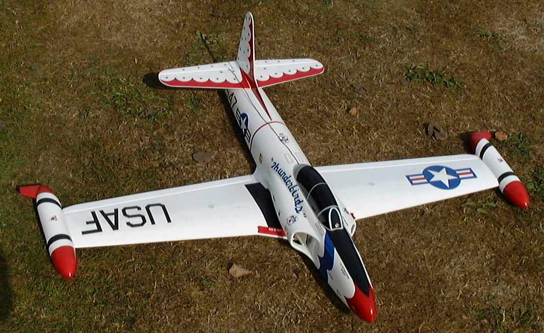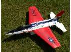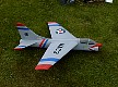 T33 77kb T33 76kb T33 91 kb T33 93kb Man wird wohl lange suchen müssen, um ein Modell mit einem besseren Preis-Leistungsverhältnis als die komplett mit Motor, Impeller und riesigem Dekorbogen ausgestattete T33 von Kyosho zu finden. Der aus relativ hartem, feinporigem Styro bestehende Rumpf hat eine gute Passung und glatte Oberfläche. Ich habe ihn zur Vermeidung von Dellen trotzdem noch mit Papier bespannt und Acrylfarbe lackiert. Die sehr leichten Flächen sind im vorderen Drittel mit Styropor ausgeschäumt, ab Holmbereich hohl. Das Ganze ist mit einer glatten Kunststoffschicht überzogen, die keine Nachbehandlung mehr benötigt. Die einzigen konstruktiven Schwachpunkte sind m.E. die mühsam herauszuarbeitenden Scharniere von Fläche und HLW sowie die Haubenbefestigung. Bei den Scharnieren fiel mir auch nichts Besseres ein, die Haube habe ich mit Magnetstücken eines defekten Neodym- Motors und einem 2mm Goldstecker befestigt. So ist sie mit einem Griff ab und wieder drauf. Der mitgelieferte Impeller sah nicht schlecht aus, der Motor erwies sich bei Testläufen als höher belastbar und mit besserem Wirkungsgrad ausgestattet, als Speed 480 und Konsorten. Da ich aber aus der Gnat noch die Kombination Wemo/HP 200 verfügbar hatte, wurde dieser Antrieb (mit einem etwas geringeren Durchmesser gegenüber dem Originalrotor) eingebaut. Die T33 wird, wie alle meine nicht-bodenstartfähigen Impellermodelle mit dem Gummiseil gestartet. Das Modell hat ausgezeichnete Flugeigenschaften, Rollen, Loopings und ähnliche Manöver sind kein Problem. Meine T33 ist z.Zt. mit 10x1250SanyoSCR ausgestattet und ist ca.5min gut unterwegs. Ein Clubkamerad hat das Modell mit dem Originalrotor und 10Zellen Sanyo2000 ausgestattet. Steigleistung und Geschwindigkeit sind damit enorm, allerdings sind bei dieser Auslegung nach einigen Flügen sowohl der mitgelieferte Motor als auch ein danach eingebauter HP 200 durch verbrannte Kollektoren ausgefallen. Inzwischen wurde das Modell auf die neuen Panasonic 2000 NIMH Zellen umgerüstet. Gegenüber den 1250SCR ergibt dies echte 40% mehr Flugzeit. Mit dem Sanyo Akku beträgt die Flugzeit bei Dauervollgas 3,5Min, mit dem genauso schweren NIMH-Akku steigt sie bei etwas reduzierter Anfangsleistung auf 5,5Min. Natürlich fließt der Strom für die T33 jetzt auch aus einem 3-zelligenLipo-Akku - 3,9 Ah - mit drastisch gesteigerten Flugleistungen.