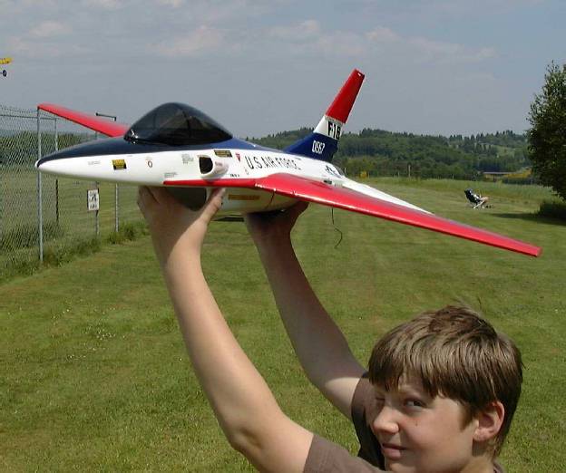 leider ohne Bilder, da das Modell einer Störung (ehrlich) zum Opfer gefallen ist. Ich möchte ihr trotzdem einige Zeilen widmen, weil das Modell, wenn man es nicht mit dem dazu angebotenen Robbe-Impeller ausrüstet, preisgünstig, schnell gebaut und gut zu fliegen ist. Meine Gnat war mit dem kleinen Wemotec-Impeller, dem HP 200/6 und 9x800 SanyoAR ausgerüstet und nur 770gr schwer. Damit war das Modell sehr gut motorisiert, die Flugeigenschaften sind ausgewogen und das Flugbild super. Um auf eine vorbildgetreue Geschwindigkeit zu kommen, habe ich ein Strahlrohr mit sich verjüngendem Querschnitt eingebaut. Herstellung siehe -- Tipps. Auch diese Modell fliegt inzwischen mit 3 Lipos, 2,2 Ah deutlich besser und länger.