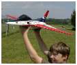 Der Bausatz der F16 überzeugt durch das Preis-/Leistungsverhältnis, den Vorfertigungsgrad und die gegenüber der T33 verbesserte Oberflächenbeschichtung. Die billige Massenfertigung fordert allerdings ihren Tribut: bei meinem Modell mußte eine Flächenhälfte eingeschickt und ersetzt werden, weil die Anschlußrippe im falschen Winkel angeschliffen war. Auf die richtige Positionierung der Ausschnitte für die Zungen der Befestigung der Höhenleitwerke hätte ich mich besser auch nicht verlassen - die bereits angeklebten Leitwerkshälften saßen unterschiedlich hoch und dabei mit ungleicher EWD und mußten wieder abgesägt und neu befestigt werden. Ansonsten ist der Aufbau gut durchdacht und stabil, der Dekorbogen super. Spitze ist auch der saugend passende und stabile Styroporständer - Bild1 - Bild2. Änderungen: Den Originalimpeller habe ich durch eine Kombination aus Wemo Minifan und BL 400-36 ersetzt. Das Seitenruder wurde nicht angelenkt - ich weiß nicht so recht, was ich bei einem solchen Modell damit machen soll. In die Kufe habe ich eine Verstärkung aus Birkensperrholz eingearbeitet. Diese stabilisiert die vordere Rundung, auf der das Modell landet und den Bereich,in dem der Ausschnitt für den Ring der Gummiflitsche liegt - Bild. Nicht gut gelöst ist auch die Befestigung der Kabinenhaube - ohne Spant und mit 2 Holzschrauben. Ich habe der Haube einen Rahmen aus sehr leichtem Balsa verpaßt. Dieser wird von hinten unter eine Balsakonstruktion auf dem Rumpf geschoben und die Haube vorn mit einem 2mm Goldstecker arretiert. So sitzt die Haube sauber und stabil auf und man kann sie durch Herausziehen des Steckers/Zurückziehen der Haube mit einem Griff abnehmen - Bild. Zur Befestigung des Flugakkus habe ich unter den hinteren Bereich der Kabinenauflage eine M4 Einschlagmutter (von unten in den Rumpf) eingeharzt. Dadurch drehe ich eine ( durch die Kabinenhaube verdeckte ) M4 Nylonschraube auf den Akku und klemme ihn damit zusätzlich fest. Zunächst wollte ich das Modell mit 8xSanyo 3000 NIMH ausrüsten. In Abweichung von Meßwerten aus dem Internet ergab sich aber nur eine Stromaufnahme von 20A - evtl. auch wegen der langen Leitungen, Steckverbindungen usw. Um bei den ersten Starts genug Leistung zu haben, baute ich einen gerade arbeitslosen 9x1100SanyoSCR ein. Die Stromaufnahme liegt jetzt bei ca 24A. Fliegen: Durch Weglassen des Seitenruderservos und den leichteren Akku wird ein Abfluggewicht von 1070gr gegenüber der Herstellerangabe von 1150gr erreicht. Die F 16 flog bereits beim ersten Start von der Flitsche mit geringen Trimmkorrekturen. Halbgas reicht zum zügigen Herumfliegen und leichtem Steigen. Mit Vollgas wird ein Steigwinkel von ca 35° und die Geschwindigkeit eines 6,5ccm-Kunstflugtrainers erreicht. Der Motor hat dabei durchaus noch Reserven. Das Flugverhalten ist bis auf eine leichte Instabilität um die Längsachse gutmütig. Einfache Kunstflugfiguren sind möglich, am liebsten fliegt die F 16 natürlich Rollen. Die Landung ist aufgrund des guten Gleitwinkels problemlos. Mit dem 1100er Akku beträgt die Flugzeit ( mit Teillast) ca 4 Min. Obwohl das relativ kurz ist, bleibt der Akku wegen der sehr guten Flugleistungen und weil er sehr schnell aufgeladen werden kann zunächst einmal drin. Sehr vorteilhaft ist letztlich die zusätzliche Luftansaugung unter der Kabine.Diese Luft strömt an Regler und Akku vorbei, die dadurch gerade handwarm werden. Auch deshalb kann der Akku nach dem Flug sofort wieder an den Lader.
