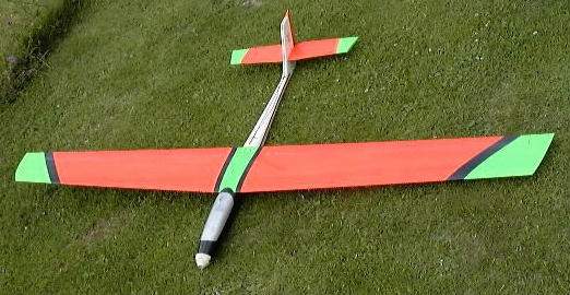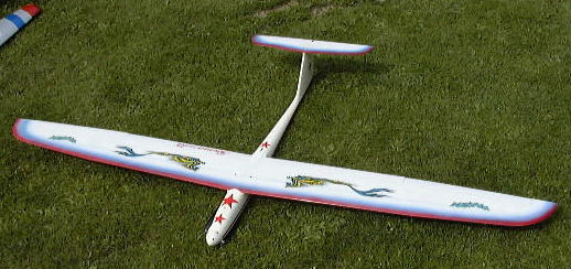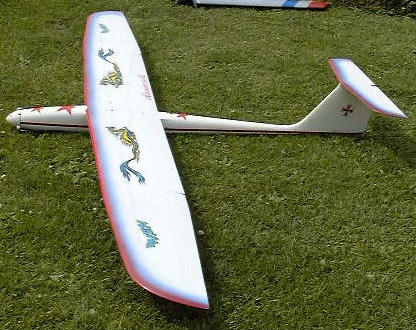 Von mir oft und gerne geflogener Voll-GFK-Segler östlicher Provenienz. Mit Ultra 1800/5 und 20xSanyo 1000AR auch senkrecht unterwegs. Erwähnenswert der darin eingebaute 80Amp.-Regler von Manz mit Schaltregler-BEC, der seit Jahren zuverlässig die 3 Servos aus 20Zellen mit 5V versorgt. Mit einer Flächenschraube sehr schneller Zugang zum Akku. Der Regler liegt (einigermaßen) geschützt in der oberen Rundung des Rumpfvorderteils, Empfänger und HR-Servo auf einem festgeschraubten Brettchen im Rumpf hinter dem Flächenausschnitt. Abbildung