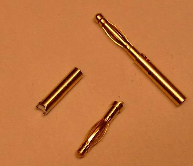 Die 2mm Goldstecker z.B. von Nessel für ca.1,30DM ( trennbare Einheit aus Stecker und Buchse) Bild sieht man viel zu selten. Sie sind platzsparend klein, leicht und haben einen sehr guten Übergangswiderstand. Bis ca. 20A sind sie erste Wahl. Wenn es von der Zugänglichkeit her geht, löte ich sie direkt auf den Akku. Bild