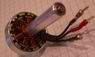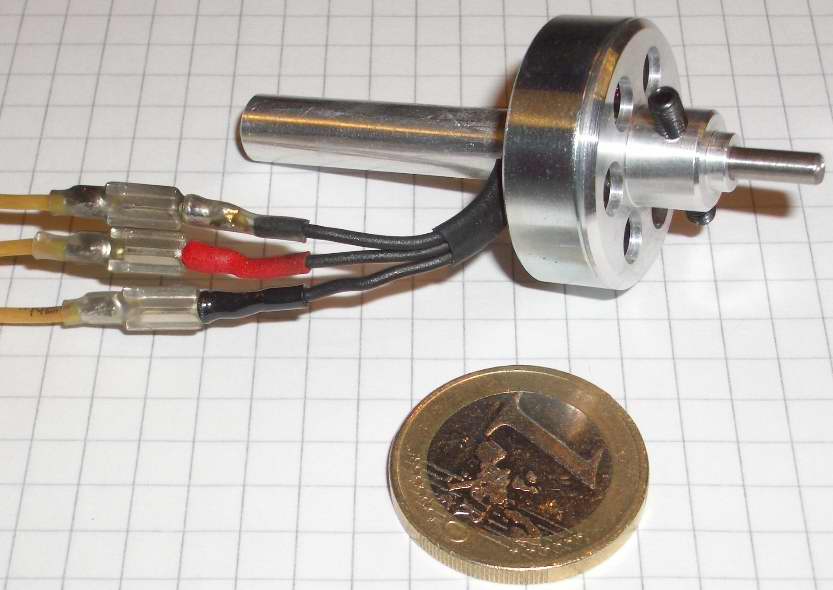 Der Bausatz wird wahlweise mit 0,5mm Cu-Draht für 13 oder mit 0,45/0,425 für 15 oder 17 Windungen geliefert. Ich entschied micht für die erstgenannte Variante. Das Wickeln nimmt einige Zeit in Anspruch, da die angegebene Windungszahl nur bei sauberem Wickeln und Durchfädeln der letzten Windung auf den Stator paßt. Wenn noch was drauf geht, hat man sich verzählt. Das Einkleben der Magnete ist durch eine mitgelieferte Schablone vereinfacht aber etwas fummelig. Wenn man den Abstand von ca. 1,8mm zwischen 2 Magneten nur ein wenig unterschreitet hängen die Burschen aneinander und man muß sie neu ausrichten, wobei mit etwas Pech der nächste Magnet andockt. Sitzen die Magnete schließlich richtig, läßt man nur noch etwas dünnflüssigen Sekundenkleber an der Innenseite der Glocke entlang laufen und alles ist fest. Beim Einschieben der Welle ist kein Spiel feststellbar, Rundlauf der Glocke und Abstand der Magnete sind zum Stator sind perfekt. Die Bauanleitung läßt keine Fragen offen. Das Gewicht mit Anschlußsteckern und Schrumpfschlauch ist 21,5 gr.