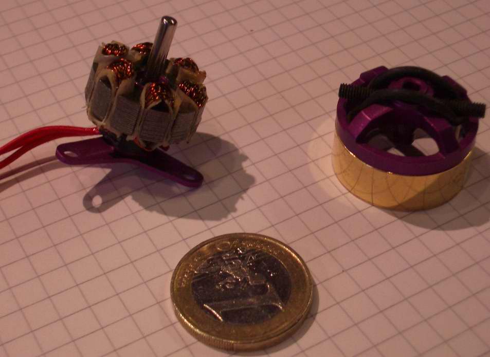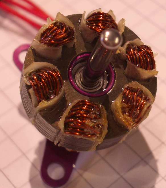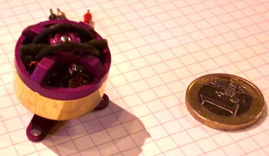Der Außenläufer mit einem Gewicht von 24 gr ist derzeit für einen fertigen Motor konkurrenzlos preisgünstig. Bei Preis und Gewicht ist zu berücksichtigen, dass darin Befestigung und Propsaver enthalten sind. Die Fertigungsqualität ist, was die eloxierte Glocke und die Befestigung anbelangt, sehr gut. Die Spalte zwischen den Magneten sind vergossen. Weniger überzeugend sind die chaotische Wicklung des Stators mit Papierisolierung und die etwas zu knapp bemessene Luftschraubenaufnahme. Letzteres führt dazu, dass die Luftschraube bei höheren Leistungen seitlich wegklappt und durch ein zweites Gummi befestigt werden muß. Ich hätte auch noch die Welle im Stator und dem Befestigungsteil unter Inkaufnahme eines minimalen Mehrgewichts etwas verlängert um die Abstände zwischen den beiden Lagern zu verlängern. Bislang ist die Lagerung aber noch ausreichend spielfrei.
