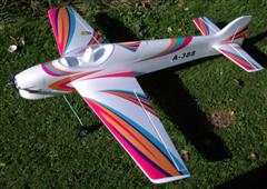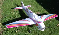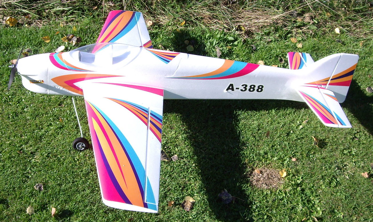Zunächst flog ich das Modell mit einer noch verfügbaren 12x6 Dymond Luftschraube, mit der der Motor gerade mal 30 A zieht. Bereits damit ist das Modell - auch für endlose senkrechte - Steigflüge sehr gut motorisiert. Eine 13x6,5 APC E brachte schon deutlich mehr. Die Antriebsleistung kann wegen der Reserven des dicken Treiblings durch eine größere Luftschraube noch um 50% gesteigert werden. Die Flugeigenschaften des Modells werden durch die langen Hebelarme und die heute im Vergleich sehr kleinen Ruderflächen geprägt. Die Querruderwirkung ist bei Verwendung der Originalbohrungen in den Ruderhörnern für vernünftige Rollen zu gering. Auch mit dem vorgeschlagenen maßvollen Höhenruderausschlag kippt das Modell bei engeren Loopings und entsprechend großem HR-Ausschlag wegen Strömungsabriss aus der Figur. Das Seitenruder sollte man bei höherer Fluggeschwindigkeit vergessen, da das Modell dann bei Seitenruderausschlägen instabil wird. Messerflug ist deutlich schwieriger auszusteuern als bei Modellen modernerer Bauart mit kürzeren Hebeln und größeren Rudern. Hoovern kann man wegen der kleinen Ruder, die überdies aufgrund des Abstands weniger stark angeströmt werden, - zumindest als durchschnittlicher Kunstflieger und mit der normalen Schwerpunkteinstellung vergessen. Na ja, früher war nicht alles schlecht. Das Modell fliegt halt aufgrund der langen Hebel von Höhen- und Seitenruder wie die einst weit verbreiteten RC1 Modelle - es geht glatt durch großräumig geflogene Figuren, hat gute Langsamflugeigenschaften, ist recht eigenstabil und wenig windempfindlich. Der Flieger ist was für Nostalgiker, die an ihre alten RC1 Modelle erinnert werden wollen, unbedingt haben muss man ihn aber nicht.