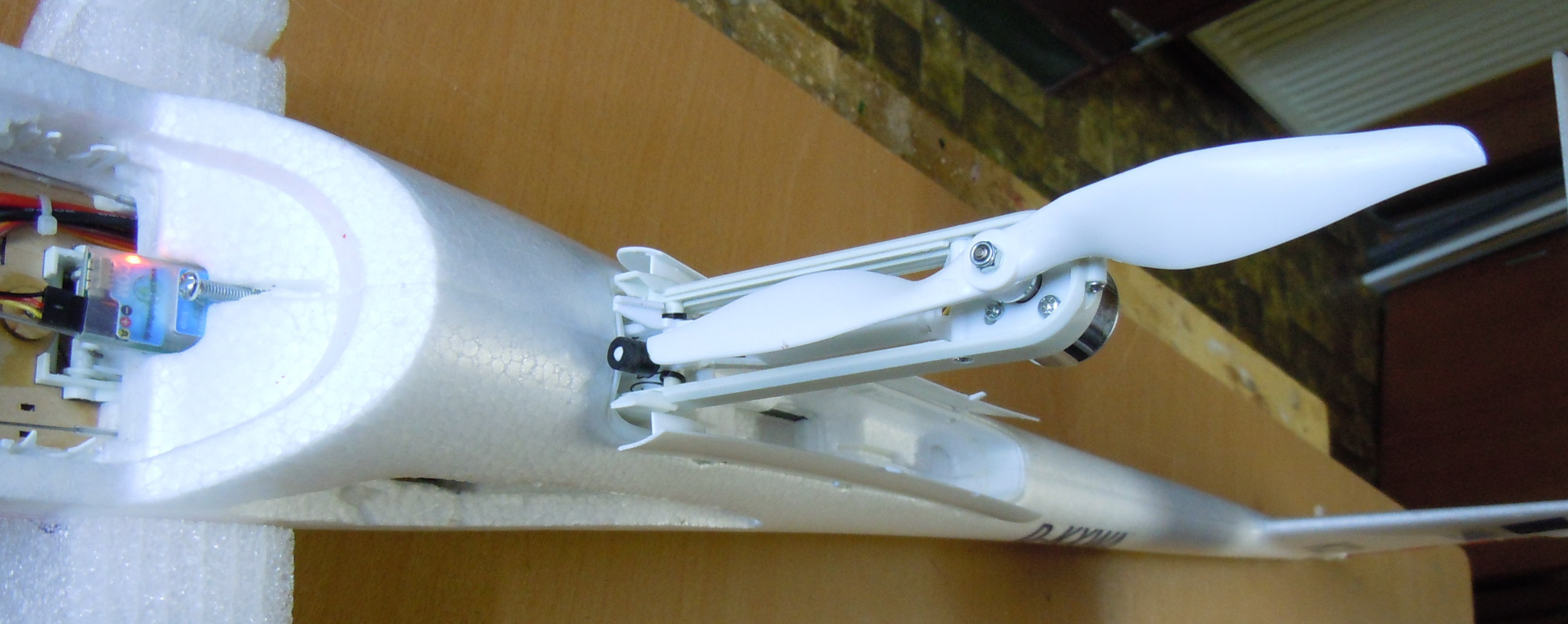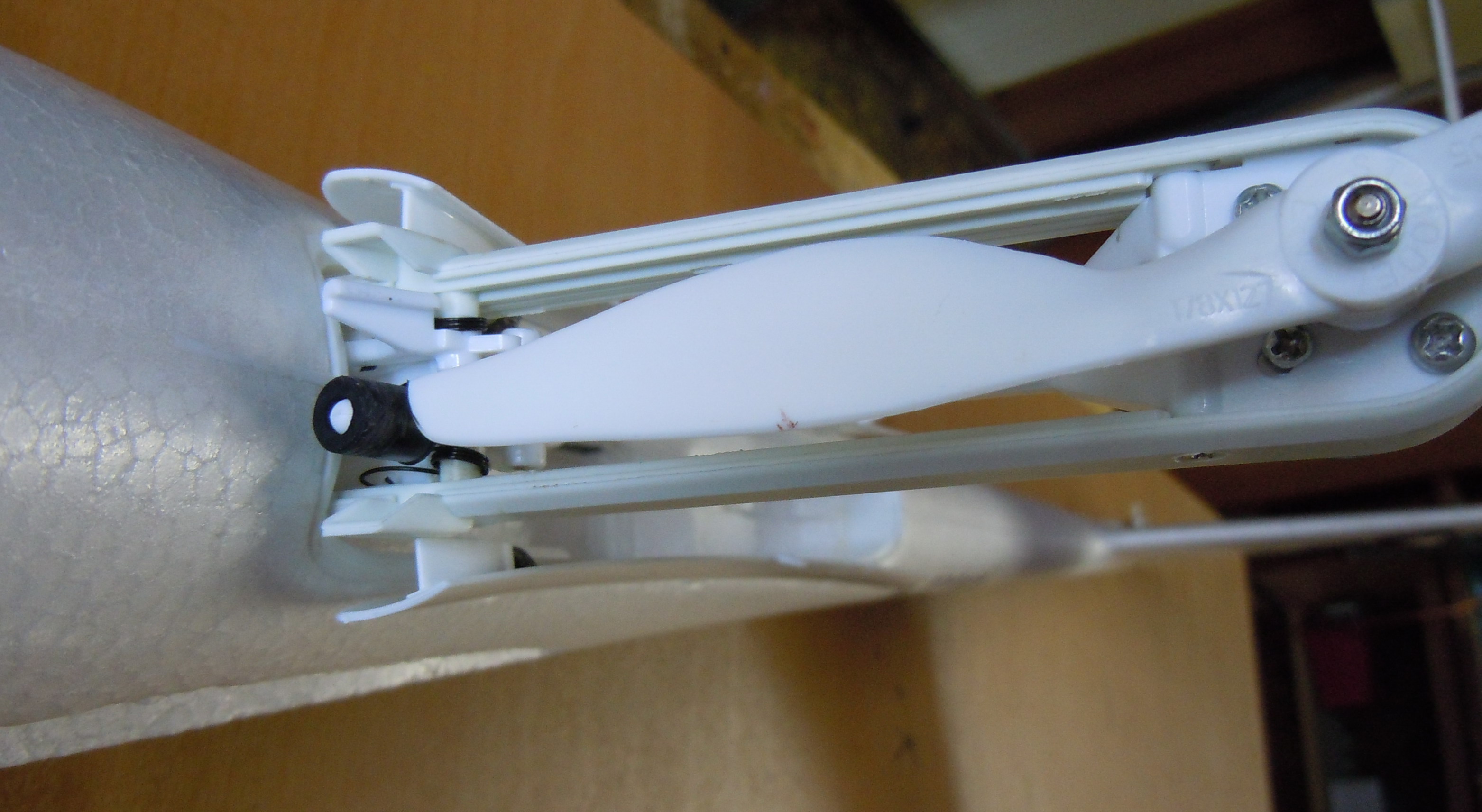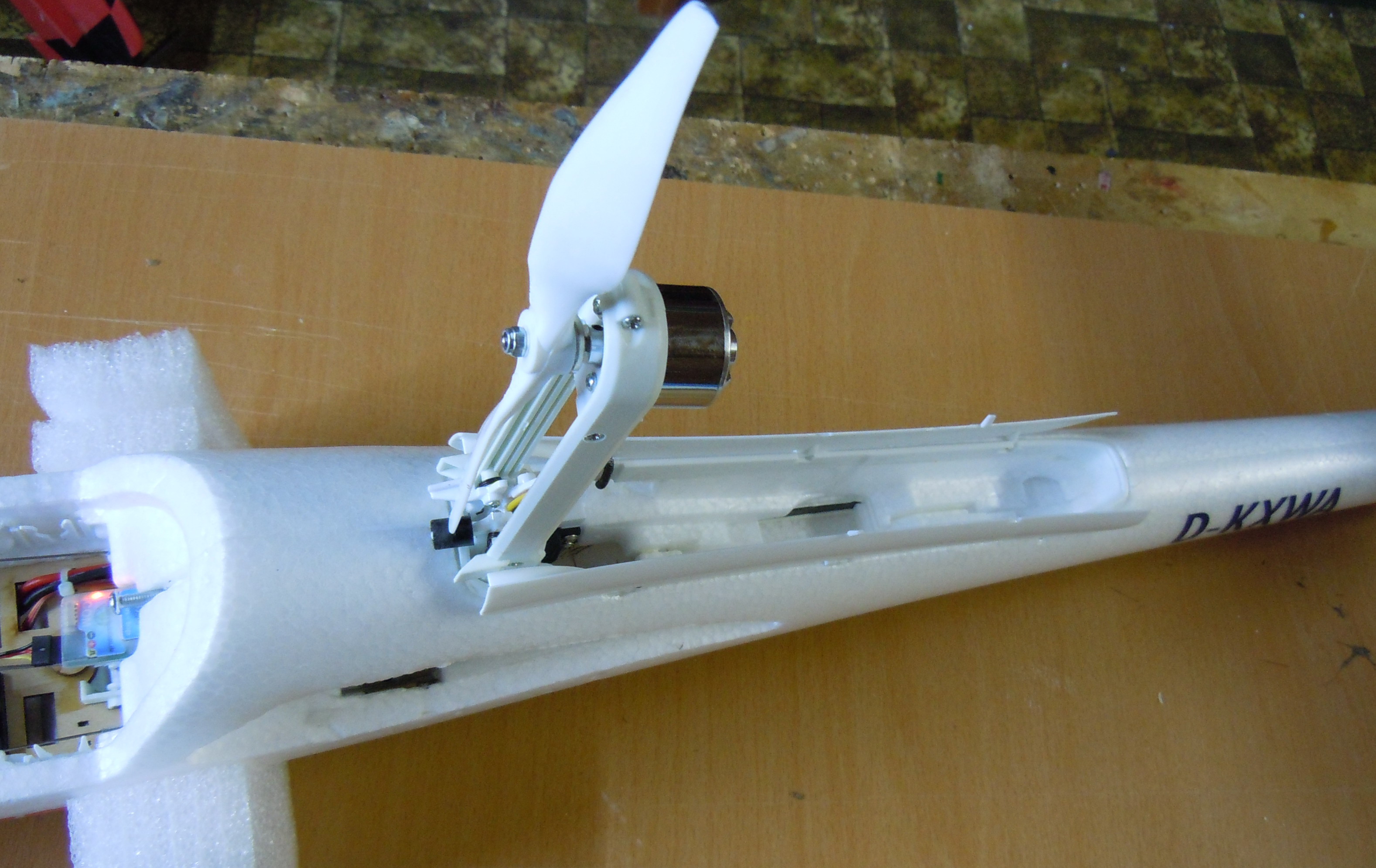 Nachtrag: Nach 3 Jahren, aber nur etwa 30 Flügen brachen nun einige der relativ dünnen Kunststoffteile des Antriebs im Flug. Mangels äußerer Einwirkungen wird das wohl auf den üblichen Schwund der Weichmacher in dem Plastikmaterial zurückzuführen sein. Das ist halt schade, denn das Modell fliegt zwar ordentlich - aber der Spass daran kam halt in erster Linie durch das innovative Klapptriebwerk Da der Flieger ansonsten noch wie neu ist, werde ich den Motor irgendwann nach alter Väter Sitte in die Rumpfnase einbauen.