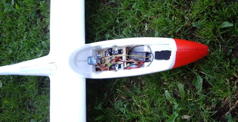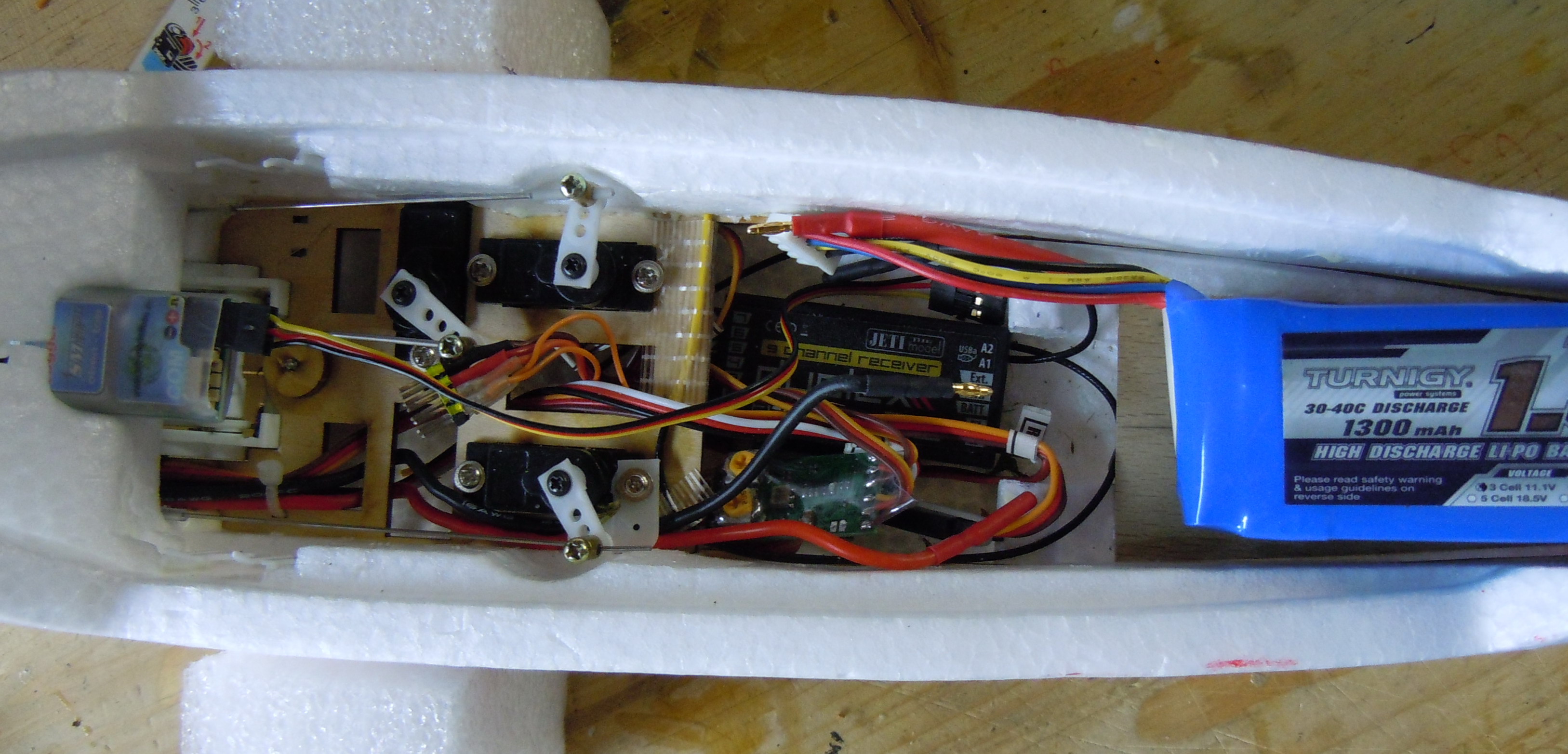 Nach längerer Programmierarbeit lief alles zufrieden stellend. Insbesondere das Klapptriebwerk fährt einwandfrei aus, startet den Motor mit der nötigen zeitlichen Verzögerung und bremst die 7x5 Luftschraube an der richtigen Stelle, damit sie wieder eingeklappt werden kann.Obwohl der 20A Regler unzugänglich unter der Fläche eingebaut wurde, geht es in Rumpf einigermaßen eng zu.- Bild4- Der empfohlene 3s/1300 Lipo passt von der Größe her und bringt exakt den vorgeschriebenen Schwerpunkt sowie eine ausreichende Flugdauer.