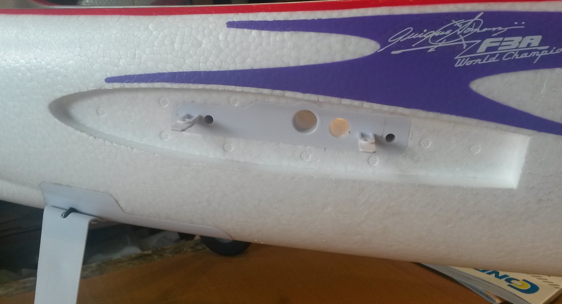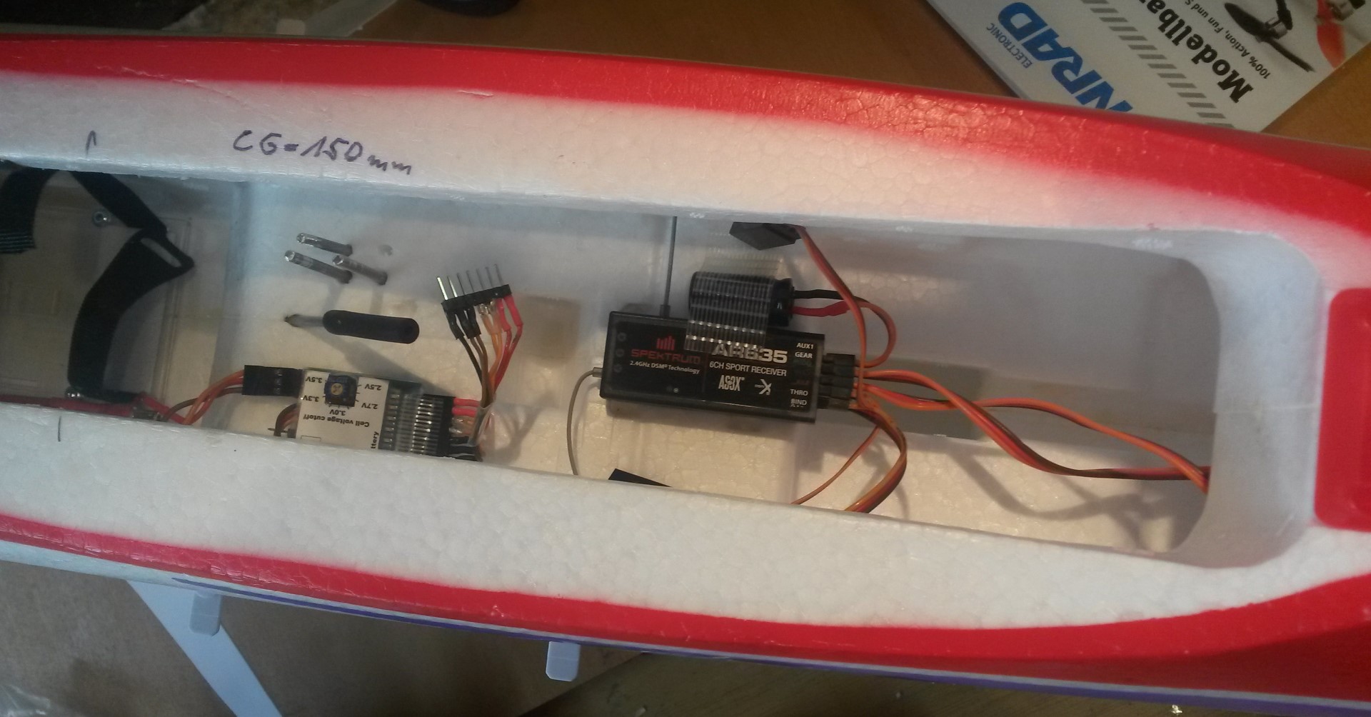 Zur Innenansicht noch ein paar Anmerkungen: Neben dem kleinen Empfänger mit eingebauter Stabilisation ist ein Elko erkennbar, der Spitzen in der Stromaufnahme abpuffern soll. Die " Cellshield " - Einzelzellen-Überwachung hatte ich noch aus alten Zeiten, zu denen größere Lipos deutlich teurer waren und dementsprechend geschützt werden sollten. Die 4 Teile daneben dienen der Flächenbefestigung. Um keine kleinen M3 Schrauben in die Flächen fummeln zu müssen, habe ich M3 Gewinde auf 3mm Alustangen geschnitten. Diese sind ca 3,5 cm lang und werden mit Hilfe eines Stücks Kraftstoffschlauch ( ohne Schraubendreher ) eingeschraubt. Der Schlauch wird jeweils abgezogen und für die nächsten " Schraube " verwendet. Nach der 4ten wandert er bis zur Demontage in die Hosentasche.