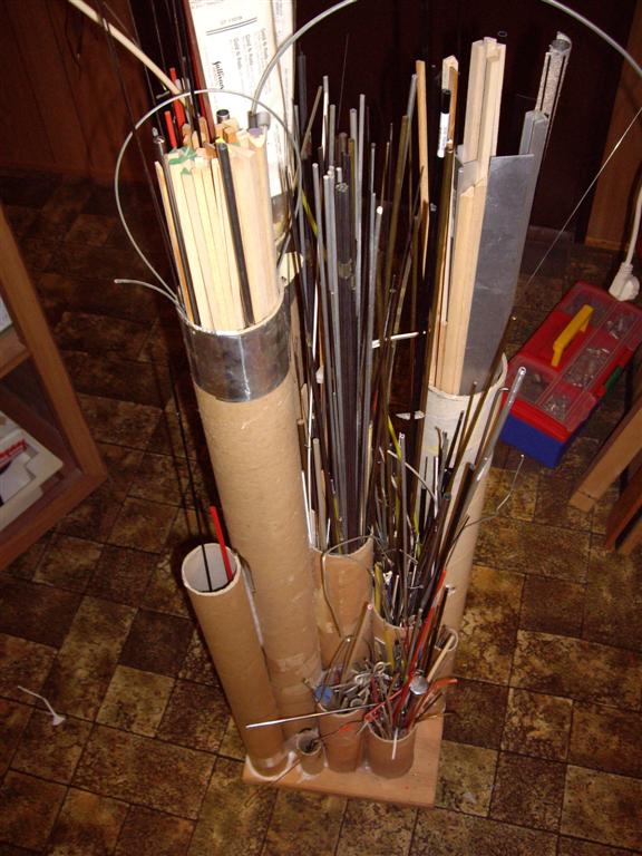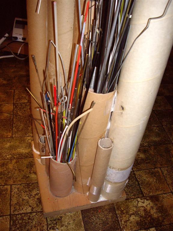 Wenn man ein paar Pappröhren/Versandrollen in unterschiedlicher Länge auf ein Brett klebt ( PU-Leim eignet sich sehr gut ) kann man darin platzsparend und übersichtlich eine große Menge von langen dünnen Materialien aufbewahren. Man kann sie auch noch besser ordnen als auf dem Bild erkennbar. 2. Bild