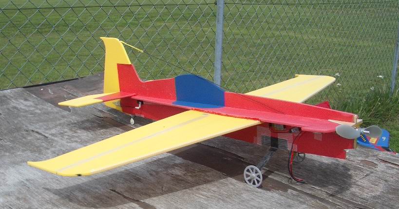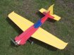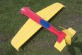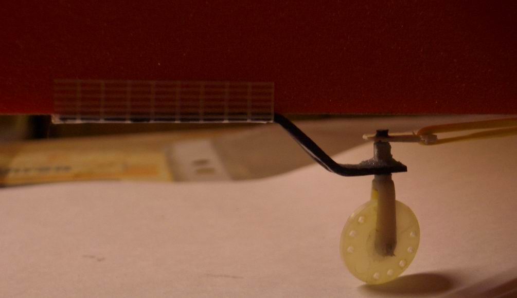 Der Flieger wird für Motore der 80gr-Liga empfohlen. Ich habe den nur 45gr schweren Axi 2208/34 eingebaut, der das Modell mit einer 9x3,8 APC-Slow und einem 115 gr schweren 1500 Lipo-Akku (es stand gerade kein leichterer zur Verfügung) endlos und über die gesamte Akkulaufzeit senkrecht steigen läßt. Der Plan sieht den Einbau eines Getriebemotors vor, man muß also einen Motorspant entwerfen und sinnvolle Verstärkungen einfallen lassen ( Bild). Das Fahrwerk wurde in bewährter Weise aus Kohleband und Epoxy hergestellt und zunächst mit Klebeband befestigt. Stolz bin ich auf die Konstruktion des lenkbaren Spornrades - Bild. Der federnde Bügel ist auch aus Kohle-Epoxy, ein Gabelkopf wird auf einen 2mm Kohlestab geklebt, dieser in einem Aluröhrchen geführt. Das Rad ist erkennbar eine Servo-Abtriebsscheibe. Das komplette Heckfahrwerk wiegt knapp 1,5 gr.Die Flugeigenschaften sind erwartungsgemäß neutral, das Modell ist sehr wendig und geht, bezogen auf die Modellgröße, relativ sauber durch die gängigen Figuren. Lediglich das Brett-Profil fordert seinen Tribut. Man kann das Modell nicht ganz so langsam machen, dafür aber recht flott fliegen. Ich meine, dass das Modell bei leichten Höhenruderkorrekturen etwas unruhiger reagiert und zum Unterschneiden neigt. Dies ist nicht mehr fest zu stellen, wenn man einen leichteren Akku - jetzt 850 mAh - fliegt. Untypisch für einen für den Hallenflug geeigneten Slowy ist die Möglichkeit, ihn noch bis etwa 2 Windstärken draußen fliegen zu können. Man muß halt nur, wie bei den anderen Foamies auch, mit reichlich Motordrehzahl landen