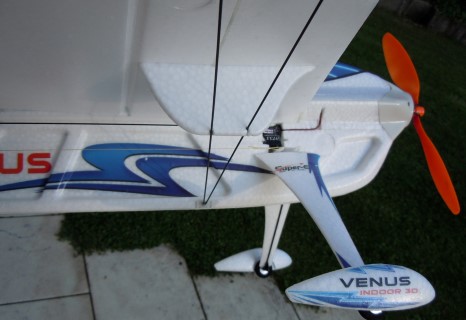 Wobei wir bei der Frage des Einsatzbereichs sind. Mit 97 cm Spannweite und mindestens 200gr Gewicht ist das Modell für den Normalanwender nur in geräumigen Hallen zu fliegen. Dem Bausatz liegen zwei Arten Speedbrakes bei. Diese könnten helfen, sind aber nicht ohne Änderungen abnehmbar. Wenn sie also mal dran sind, läuft draußen auch bei leichtem Wind nicht mehr viel. Ähnlich verhält es sich mit dem Fahrwerk. Das Original-Fahrwerk wiegt 6gr und ist aus 2mm Kohlestab und EPO-Verkleidung formschön und durchaus stabil. Allerdings sind die Räder draußen nur auf glattestem Hartplatz zu gebrauchen. Wenn man den Kohlestab nicht einklebt und das Fahrwerk durch einen Klebestreifen an der Strebenverkleidung fixiert, kann man es leicht austauschen. Ich habe für draußen ein Fahrwerk mit Rasen tauglichen Rädern und 2mm Stahlstrebe angefertigt. Dieses bringt incl. Trimmgewicht hinten ein Mehrgewicht von knapp 20 gr. Der Flieger wiegt dann für den Außeneinsatz mit größt möglichem Akku 291gr. Bei fast 1 Meter Spannweite ist das immer noch leicht.