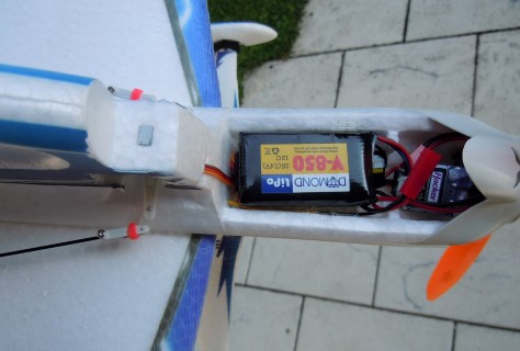 Motor, Regler und Servos sind eingebaut. Das Einkleben der Fläche, der Leitwerke und der zugehörigen Verstärkungen macht dann doch einige Arbeit, zumal dann, wenn man Wert auf Symmetrie legt. Durch die Verstrebungen mit Kohlestäben werden Fläche und Leitwerk sehr stabil, auch bei heftigen Flugmanövern flattert und verwindet sich nichts. Empfänger und Akku werden nicht, wie sonst bei Silhouetten-Modellen üblich, seitlich und sichtbar in den Rumpf eingesetzt. Diese Teile kommen vielmehr " unter die Haube ". Letztere ist incl. Magnetverschluß fertig ( s.o. 4. Bild ). Allerdings ist der Hohlraum sehr begrenzt. Für den von mir verwendeten 5-Kanal Jeti-Empfänger und einen 2s850 Lipo reichte es nach einigem Drücken und Aushöhlen der Haube gerade so. Klar, wenn man einen 350er Akku nimmt, hat man keine Probleme.